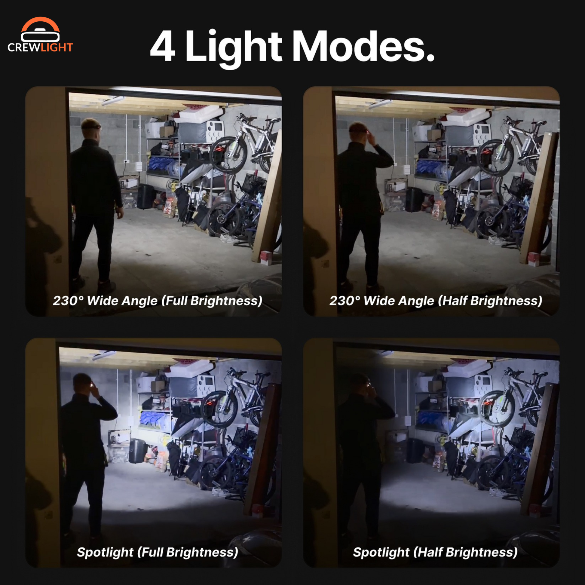 The 230-degree COB LED strip wraps across your forehead and lights up everything in front of you. Like having shop lights that move with you.